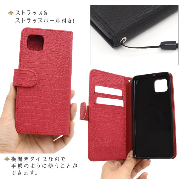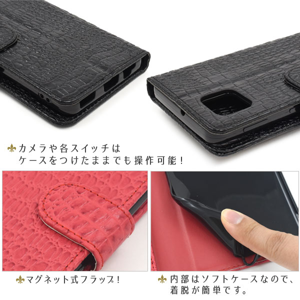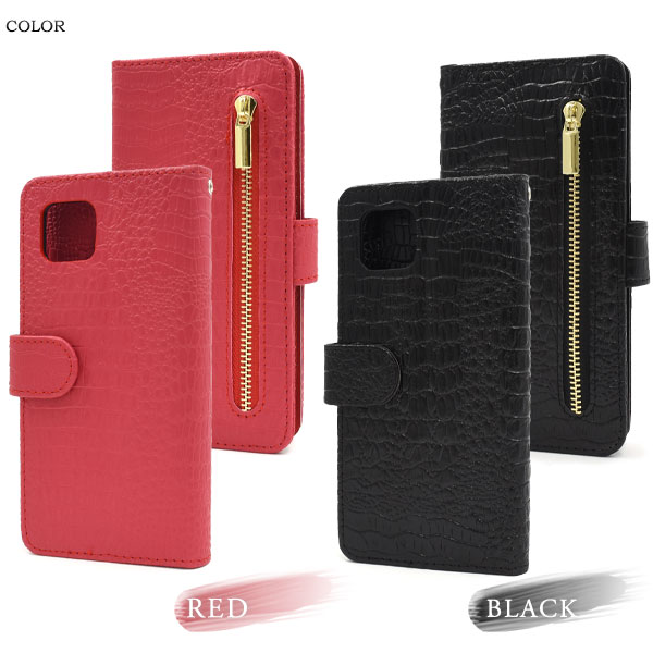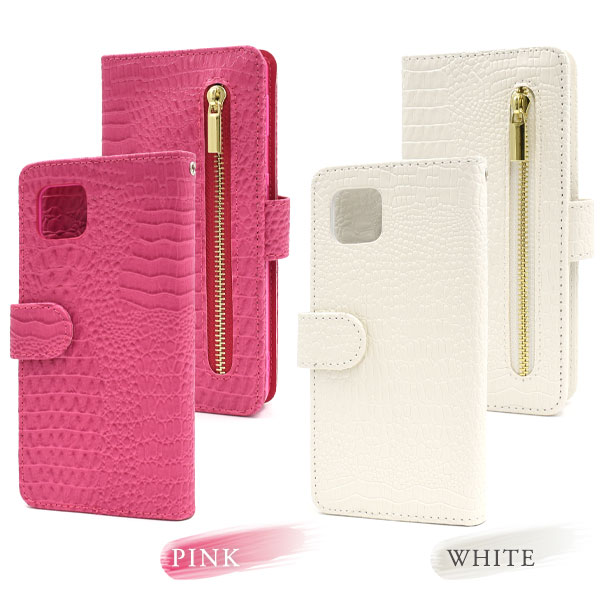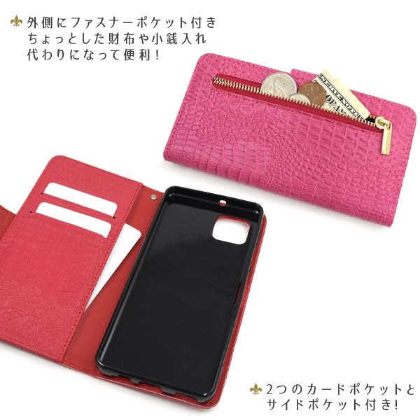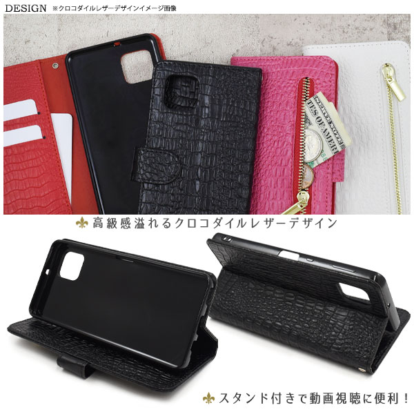 衝撃やキズなどからスマートフォンを守ります。 また、内部はソフトケースなので着脱が簡単です。 背面を折り返すとスタンドとして使用できるので、動画視聴に便利です。 横開きタイプなので、手帳のように使うことができます。 落下防止に最適なストラップホール付きです。 外側にファスナーポケットが付いているので、ちょっとした財布や小銭入れ代わりになって便利! また、内側に2つのカードポケットとサイドポケットが付いています。 高級感溢れるクロコダイルレザーデザイン。 ビジネスやカジュアルなど様々なシーンで活躍します。 | ||||||||||||||