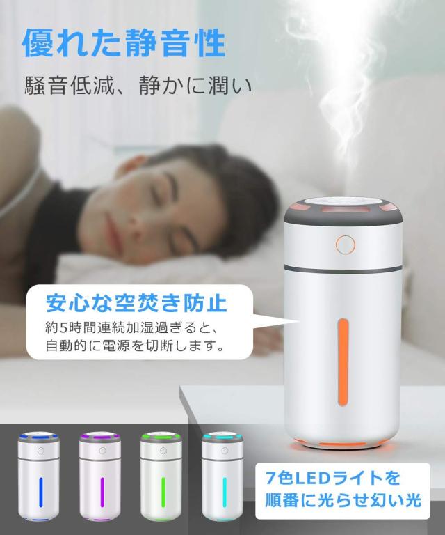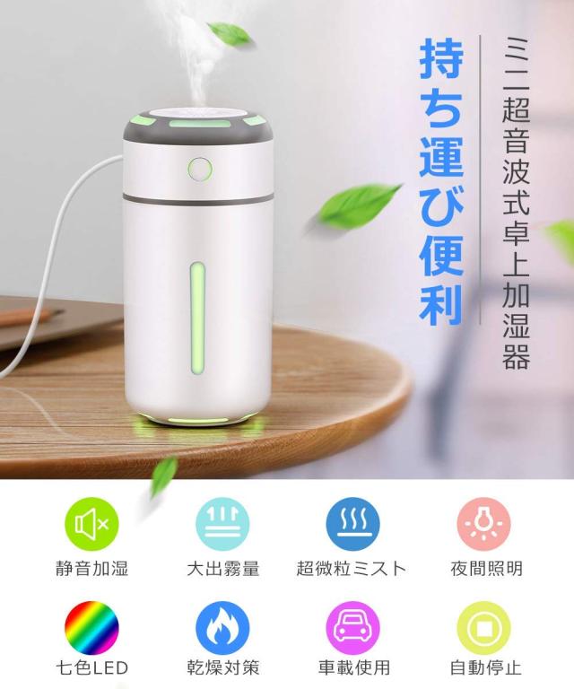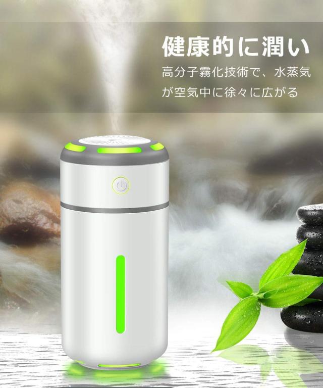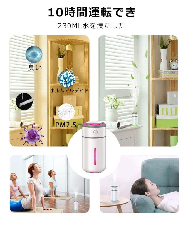 お肌の乾燥を防ぐ加湿する同時に、リラックスな雰囲気を醸し出す。パソコンやタブレットの画面を長時間見つめていると目が乾燥して、加湿によりドライアイ(目の乾き)防止にも役立つ。それに、風邪、鼻づまり、アレルギー、喘息など病気を緩和でき、秋、冬季節に最適です。