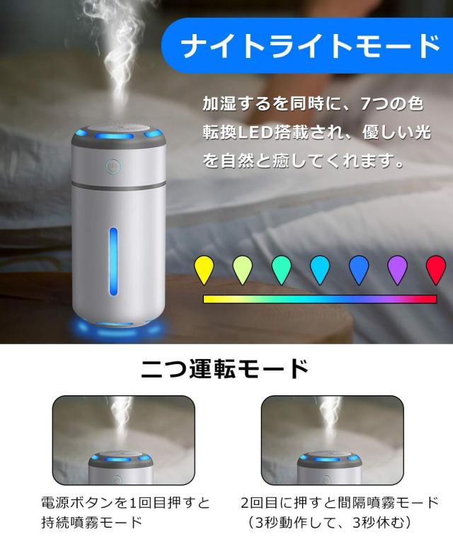 コンパクト アロマディフューザー かわいい 加湿器 除菌 USB 加湿器 卓上 超音波振動方式 ペットボトル 230ML 小型 7色変換LEDライト 部屋 車載 オフィス 乾燥 花粉症対策 空焚き防止機能搭載 静音 おしゃれ 水漏れ防止 乾燥防止