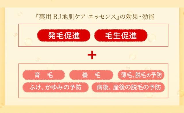 ![]() 薬用 RJ地肌ケア エッセンスは保湿成分として、ローヤルゼリーエキス配合。さらに天然有効成分配合で、頭皮環境を整え、育毛をサポートします。 |