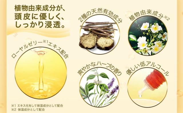 天然由来の2大有効成分で育毛をサポート/ローヤルゼリーなどの天然由来の保湿成分配合/頭皮に刺激を与えない低アルコール処方/リラックス効果のあるほのかなハーブの香り