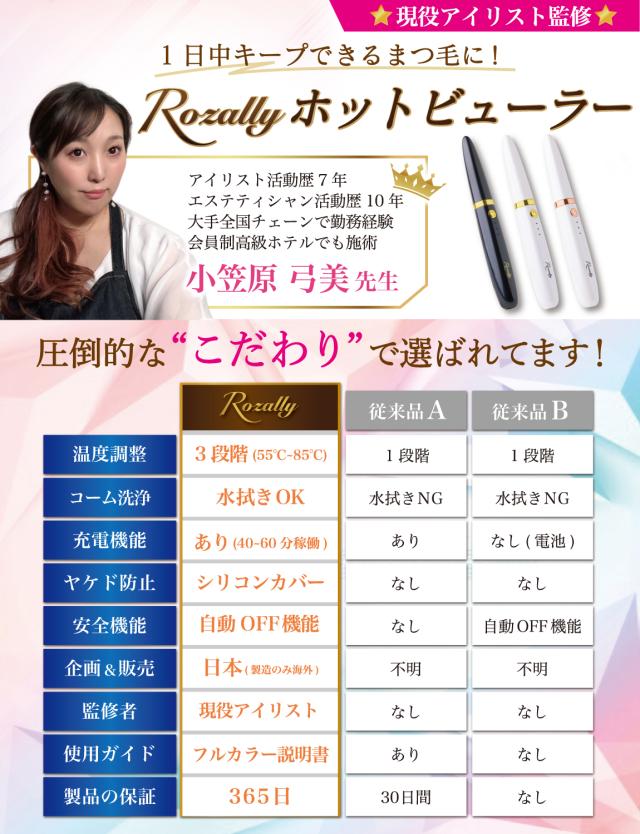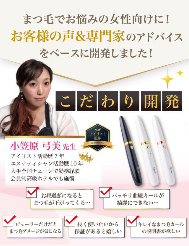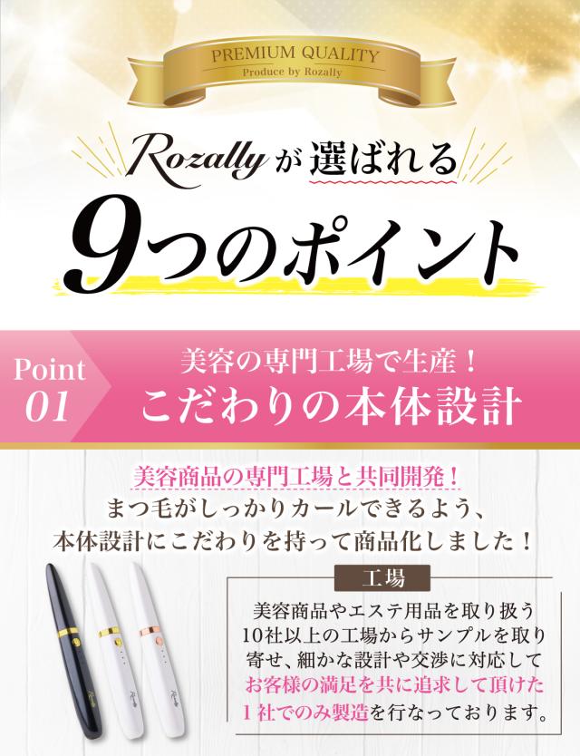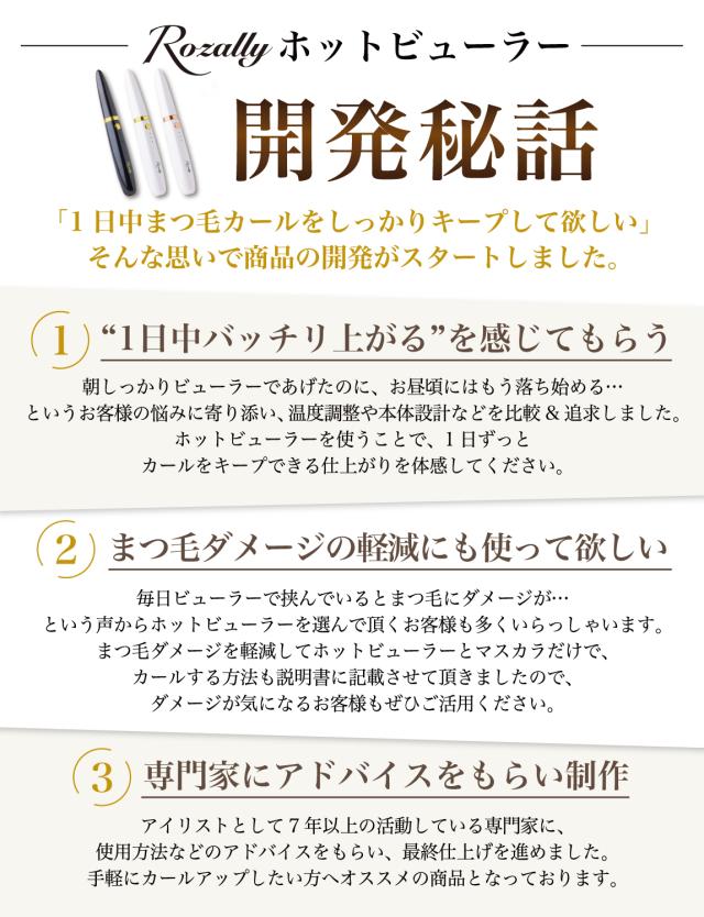 様々なメーカーから ” ホットカーラー ”や” まつ毛カーラー ”として 充電式の ホットビューラー が販売されていますが、 Rozallyの ホットビューラー は”こだわり”が一味違います。 アイラッシュカーラー や まつ毛ビューラー など まつ毛 アイテムをメインに取り扱っている 10社以上の工場からサンプルを取り寄せ、 温度調整やビューラ部分の形状を 一緒に試行錯誤して頂けた1社に絞って発注を行なっています。 また安全第一の設計で やけど防止 の機能も採用させて頂きました。 |