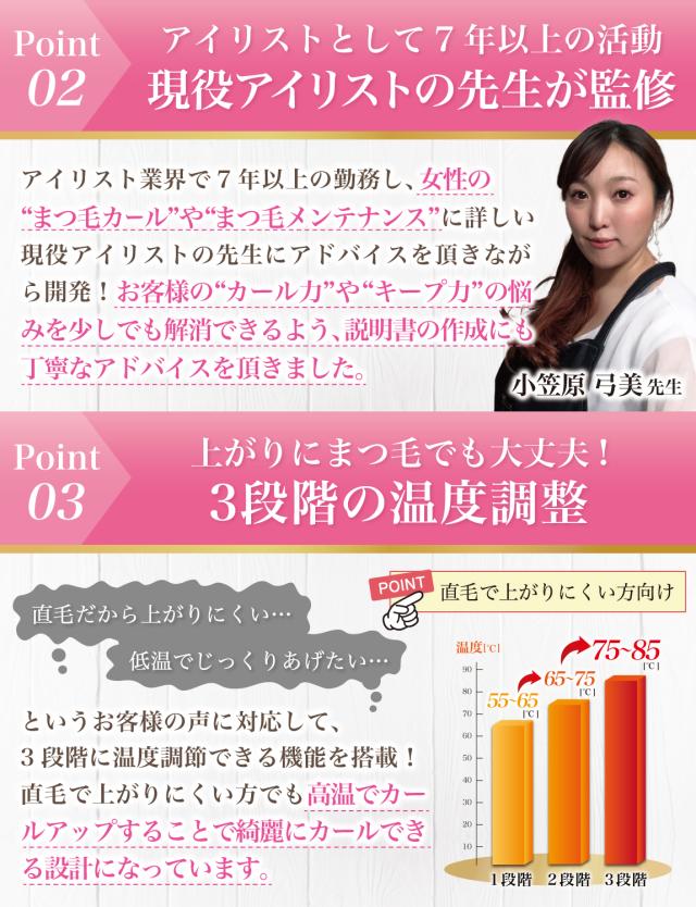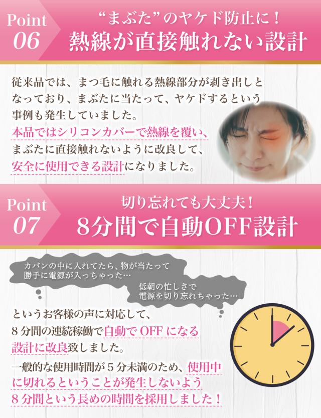最近のトレンドでは「 まつ毛ダメージ のケア」という目的で 使用されるお客様も増えています。 まつ毛ビューラー(まつげビューラー)での ダメージを気にされるお客様も多く、 ビューラーで挟む工程のないホットビューラーを 使用される方が増えてきました。 それぞれの用途に対して説明書では イラストを存分に使って使用説明させて頂いております。 |