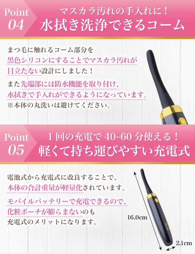 マスカラ下地とマスカラを用いてベースを作り、 ホットビューラーで形を固定することで、 初心者 の 方でも まつ毛カール が 24時間キープ できるよう設計されています。 直毛でどうしても途中で落ちてきてしまう、、 というお客様も外で カールアップ できるように 「軽量設計」+「持ち運び」を優先して企画させて頂きました。 電池式からバッテリ式に変更して軽量化ができ、 バッテリーはスマホ充電と同じ モバイルバッテリーで充電が可能となっています。 |