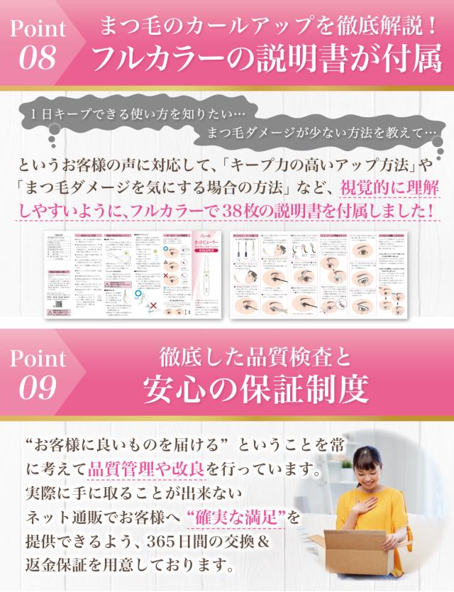 - 注文後すぐに届けていただきました。ホットビューラーで綺麗にまつ毛を上げるコツとビューラーでの下準備のコツが、説明書にかなり丁寧に記載されていてとても分かりやすかったです。