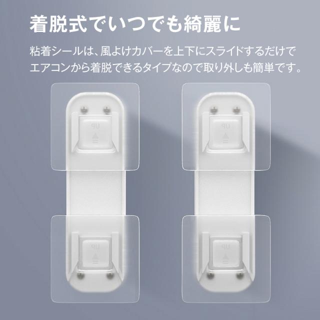 【脱着式でいつでも綺麗に】粘着シールは、風よけカバーを上下にスライドするだけで、エアコンから着脱できるタイプなので取り外しも簡単です。
