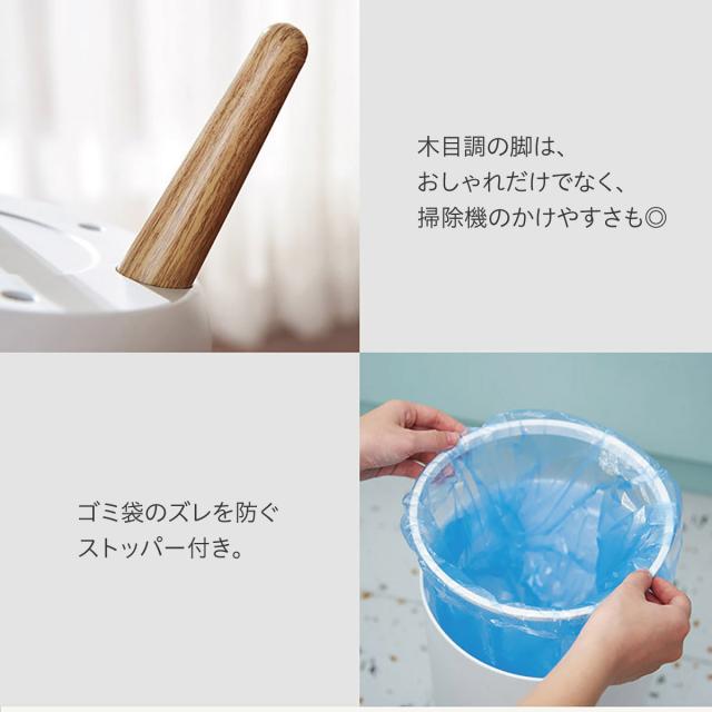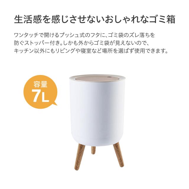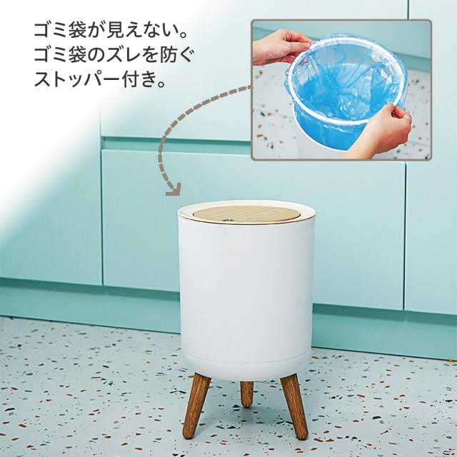 ワンタッチで開けるプッシュ式のフタに、ゴミ袋のズレ落ちを防ぐストッパー付き。しかも外からゴミ袋が見えないので、キッチン以外にもリビングや寝室など場所を選ばず使用できます。