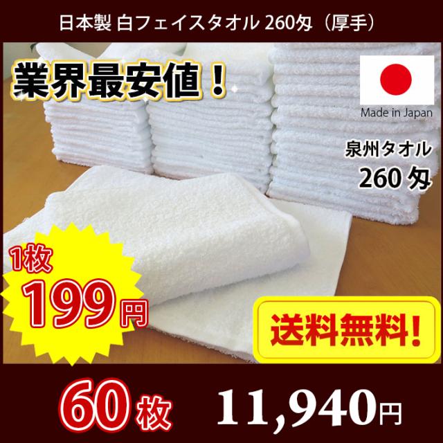 【送料無料】業界最安値! 60枚セット 日本製 泉州 白タオル 厚手 260匁 / タオル 業務用タオル フェイス 白 ホワイト 業務用 理髪店 美容院 美容室 床屋 掃除 まとめ買い 国産