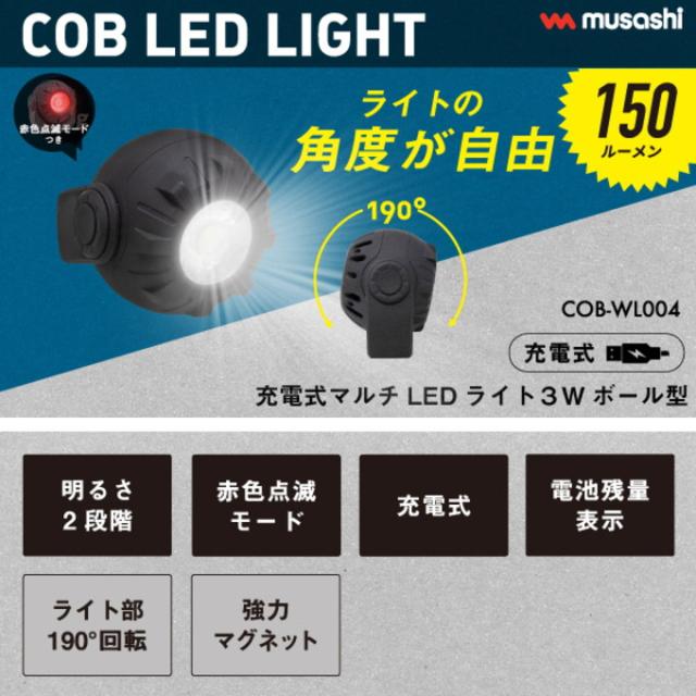 充電式 マルチLEDライト 3W ボール型 COB-WL004 送料無料 ライト 照明 充電式 コンパクト 携帯ライト アウトドア レジャー キャンプ 緊急時 災害 停電 懐中電灯 軽量 マグネット USB充電 赤色点滅