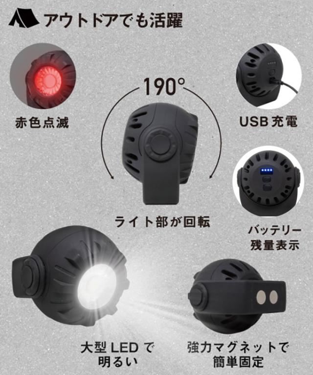 ライト部の角度が190度自由に調整できるからアウトドアでも活躍! 大型LEDで明るく照らします。強力マグネットでどこでも使える。 一目で分かるバッテリー残量表示。 明るさ2段階、赤色点滅モード付き。 |