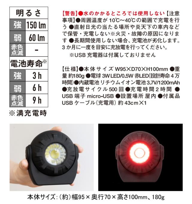強:150lm/3h 弱:60lm/6h 赤色点滅:‐/9h ※満充電時 |