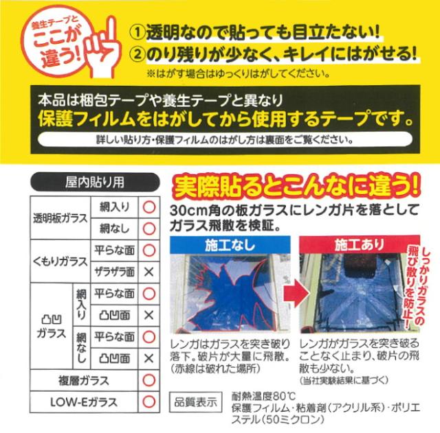 事前の災害対策&緊急事態の備えに! 貼っても目立たない透明タイプ。 防災用の地震対策用のフィルムを使いやすいテープ状に! 本品は梱包テープや養生テープと異なり、保護フィルムをはがして使用します。 1巻につき1窓(幅90cm×高さ90cmの窓の場合)に使用可能です。 防災リュックに1つ入れておくと安心です! |