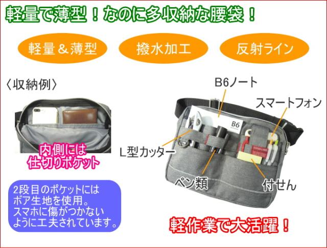 軽ワークポーチ ベルト付き KW-5 バック ポーチ ベルト付き 携帯小物入れ 腰袋 作業ポーチ 工具差し ウエストポーチ 小物入れ 腰袋 軽量 薄型 撥水加工 反射ライン スマホ