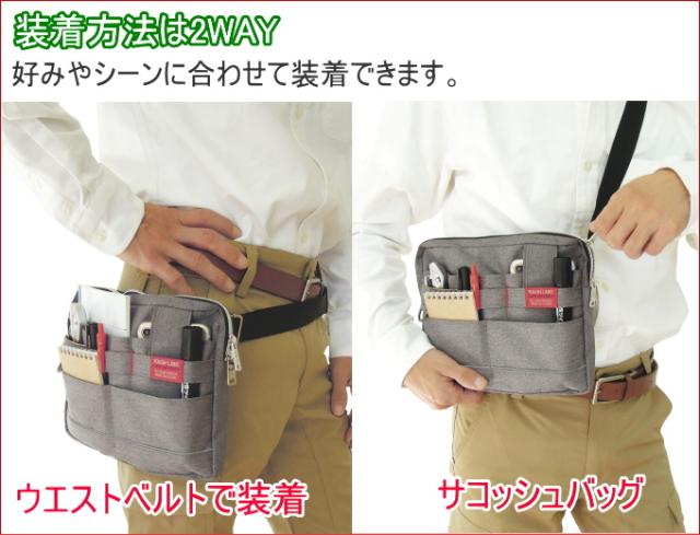 軽量で薄型なのに多収納なベルト付き小物ケース。 1段目の前ポケットにはカッターやペン、付せん&認印などが収納できます。 2段目の前ポケットはボア生地を使用。スマートフォンなど入れた時の保護する工夫がされています。 (お手持ちの電子機器等のサイズをご購入前に確認してください。) 内側には便利な仕切りポケット付き。 ウエストベルトで着用したり、サコッシュバッグとしても着用できます。 好みやシーンに合わせて装着が可能です。 撥水ポリエステルを使用しているので、屋外での作業やおでかけにもぴったり! 光に反射する反射ライン付き。 |