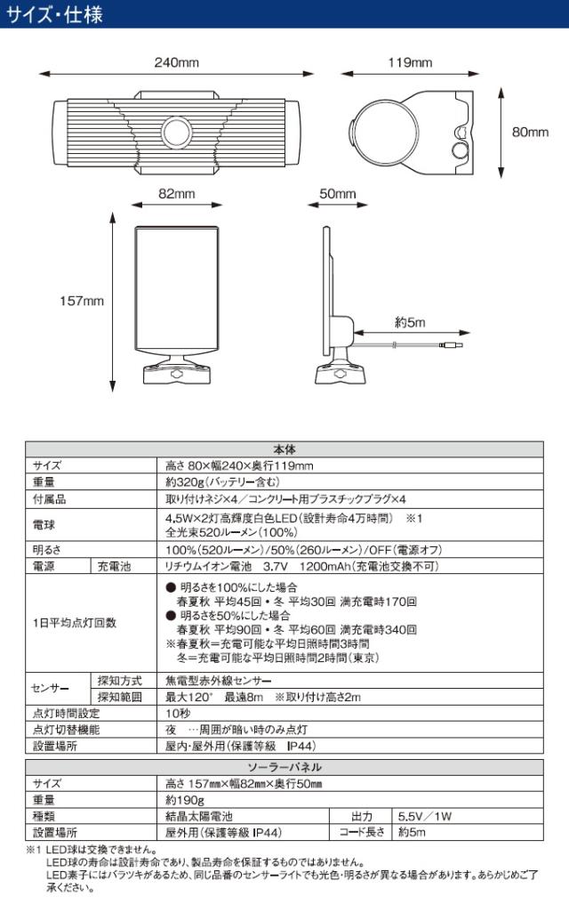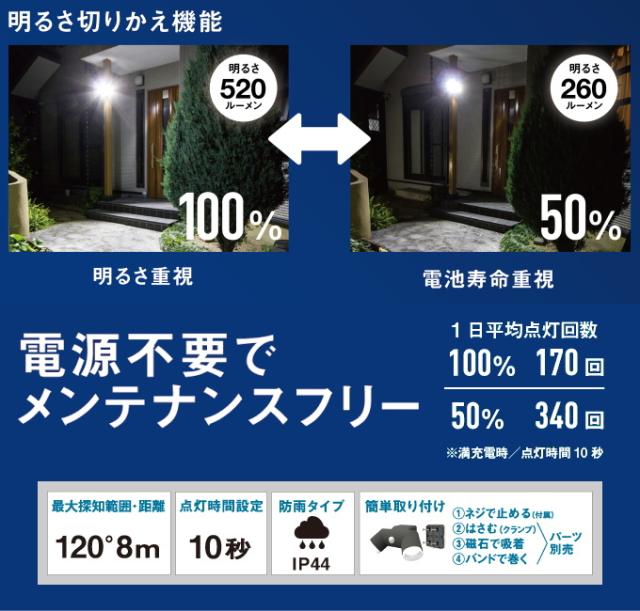 ●明るさを100%にした場合 春夏秋 平均45回・冬 平均30回 満充電時170回 ●明るさを50%にした場合 春夏秋 平均90回・冬 平均60回 満充電時340回 ※春夏秋=充電可能な平均日照時間 3時間 冬=充電可能な平均日照時間 2時間(東京) |