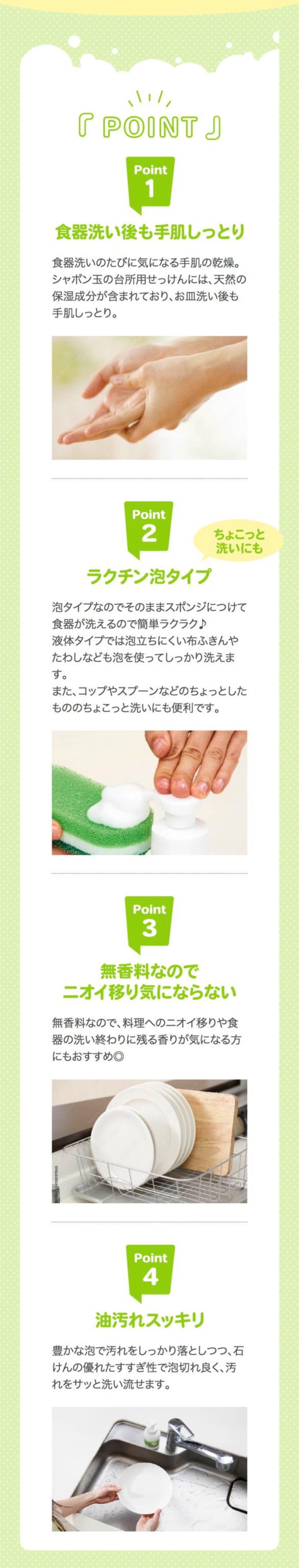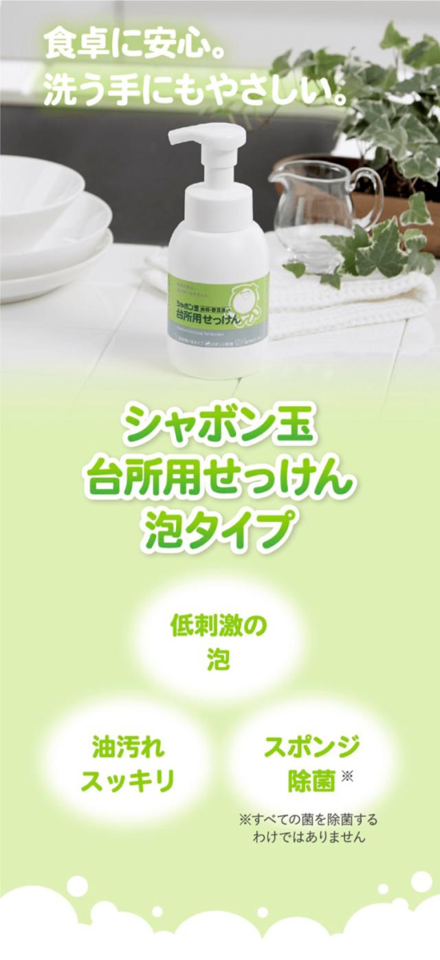 シャボン玉台所用せっけんが泡タイプになって新登場!最初から“泡”だから液だれしにくく、無駄なく使えて油汚れもスッキリ。プッシュすればすぐ泡なので、ちょっとした食器の「ちょこっと洗い」にもおすすめ。