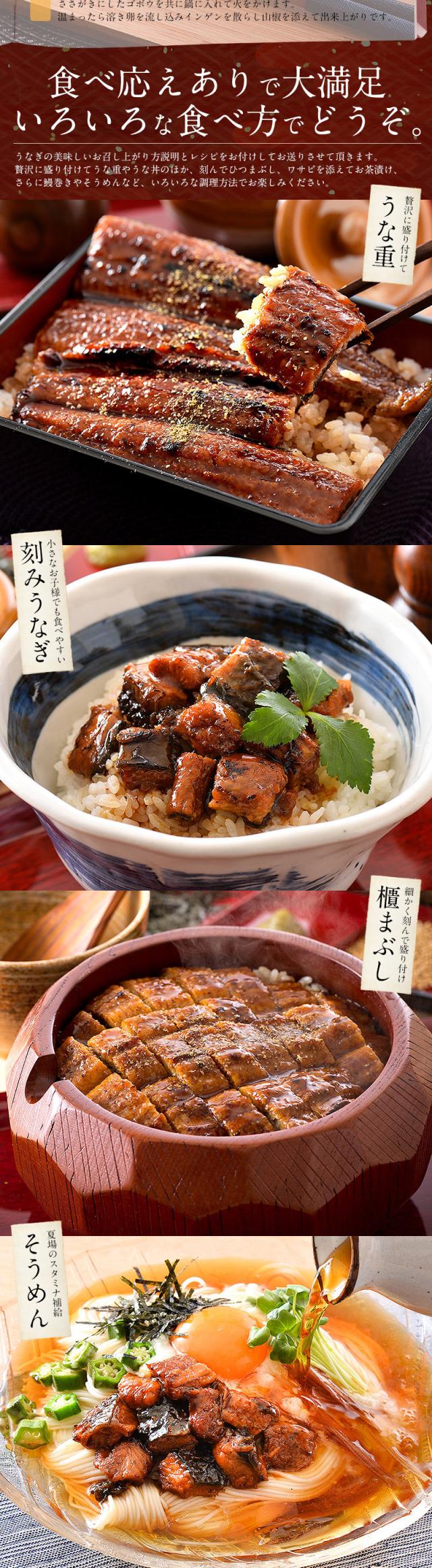 うなぎ蒲焼:うなぎ(鹿児島県産、宮崎県産)、しょうゆ、砂糖、水あめ、みりん、発酵調味料、ぶどう糖果糖液糖、澱粉/増粘剤(加工澱粉)(原料の一部に小麦、大豆を含む)/タレ:しょうゆ、砂糖、発酵調味料(水あめ、米、果糖ぶどう糖液糖、酒精、食塩)、調味料(アミノ酸等)、カラメル色素、増粘多糖類、(原料の一部に小麦、大豆を含む)、山椒末