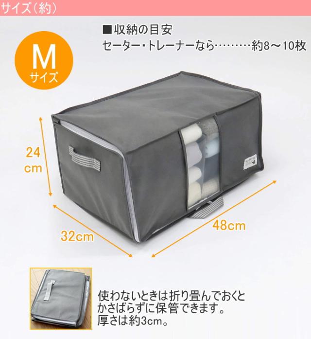シンプルなクローゼットにもなじむグレーカラー。 クローゼットの収納でよく使われるホワイトなどの収納袋と一緒に使っても統一感がでます。 前面と天面が一度に開き、収納物を出し入れしやすい収納袋です。 前面だけ開くこともできるので、積み重ねた収納袋を取り出さなくても収納物の出し入れができます。 通気性があるためカビがつきにくく、保存用に便利です。 収納物がわかる透明窓付です。 押入れやクローゼットへの出し入れに便利な持ち手付です。 防虫剤等が入れられるポケットが1ヶ所ついています。 収納物に合わせて立てたり倒したりできる仕切り板付き。 使わないときは折り畳んでコンパクトに保管できます。 |