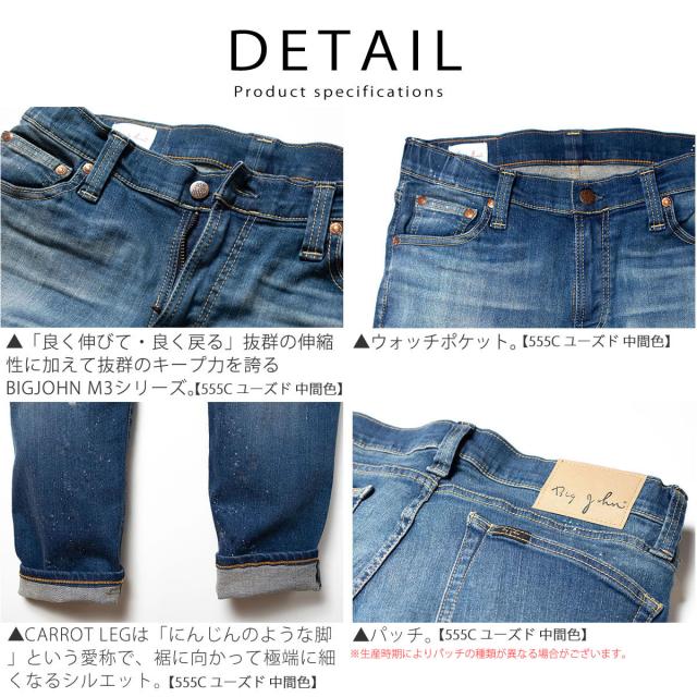■ BIG JOHN ビッグジョン商品詳細 BIG JOHN (ビッグジョン)からキャロットレッグジーンズが登場しました。 BIG JOHN M3シリーズのCARROT LEGは「にんじんのような脚」という愛称で、裾に向かって極端に細くなるシルエット。 |