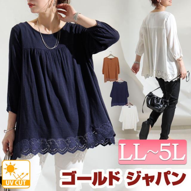 秋新作 大きいサイズ レディース トップス ブラウス シャツ UVカット裾刺繍レースブラウス 7分袖 UVカット 紫外線 刺繍 レース フレア 切替え ギャザー Aライン フレア 裾レース ボリューム袖 夏服 春服 LL 2L 3L 4L 5L オフホワイト 白 オレンジ ネイビー ゴールドジャパン