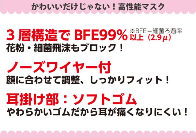 BFE99%以上の高品質フィルターを使用。花粉対策にも最適。