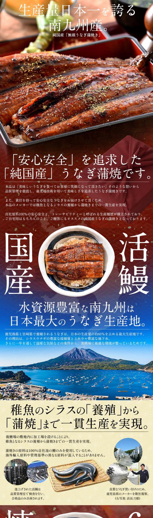 うなぎ蒲焼:うなぎ(鹿児島県産、宮崎県産)、しょうゆ、砂糖、水あめ、みりん、発酵調味料、ぶどう糖果糖液糖、澱粉/増粘剤(加工澱粉)(原料の一部に小麦、大豆を含む)/タレ:しょうゆ、砂糖、発酵調味料(水あめ、米、果糖ぶどう糖液糖、酒精、食塩)、調味料(アミノ酸等)、カラメル色素、増粘多糖類、(原料の一部に小麦、大豆を含む)、山椒末