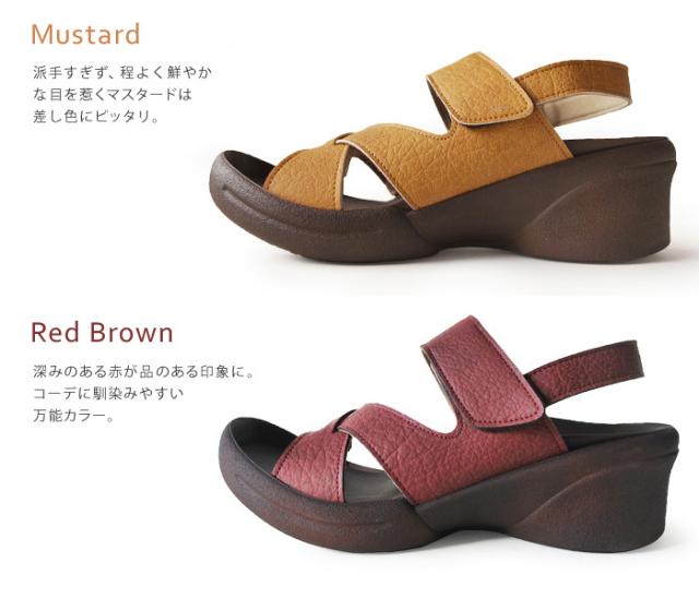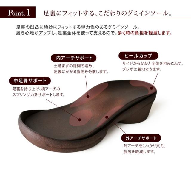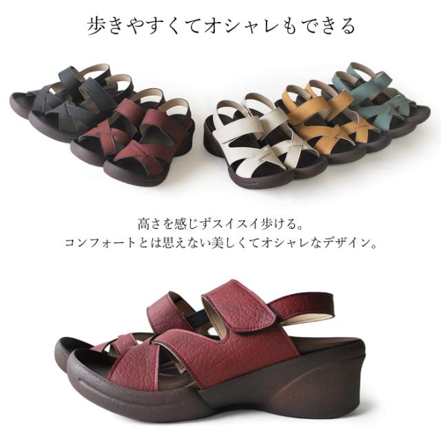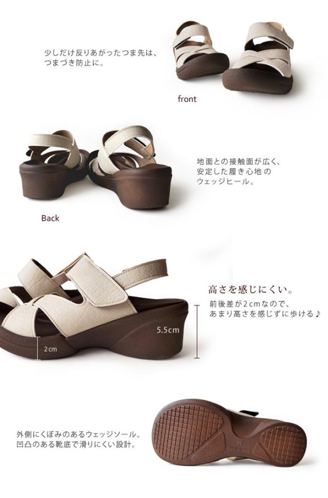 安定感のあるウェッジヒールと程よい弾力感のあるインソールで疲れにくい。