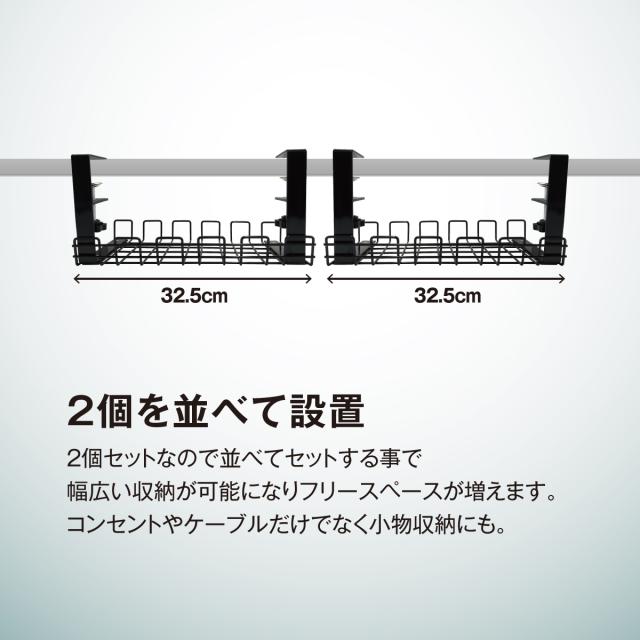 【2個を並べて設置】2個セットなので並べてセットすることで、幅広い収納が可能になりフリースペースが増えます。コンセントやケーブルだけでなく小物収納にも最適です。