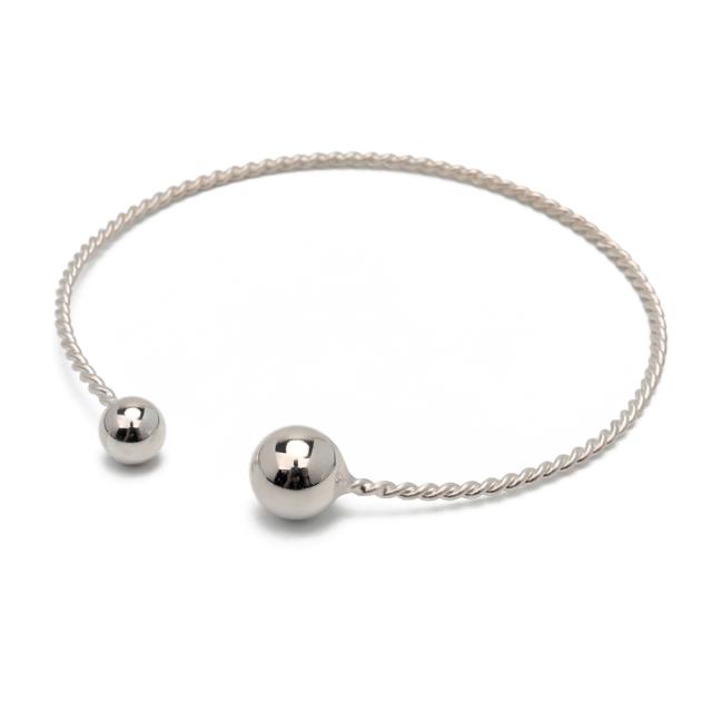 品のあるダブルボールデザインのバングル。ツイストした細身のボディが手元を美しく魅せてくれます。
