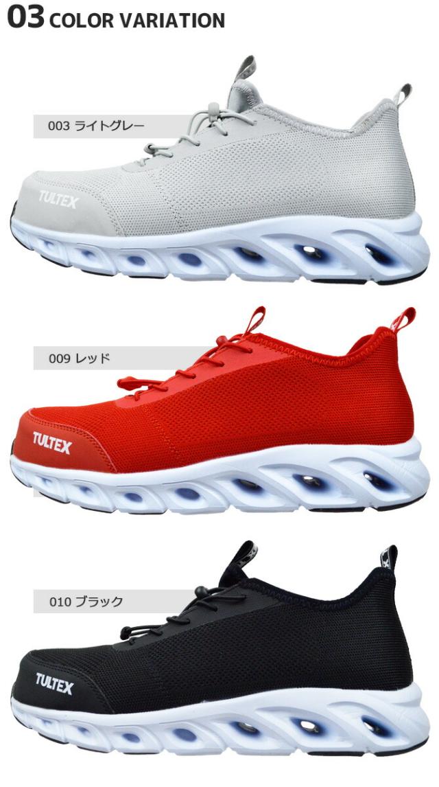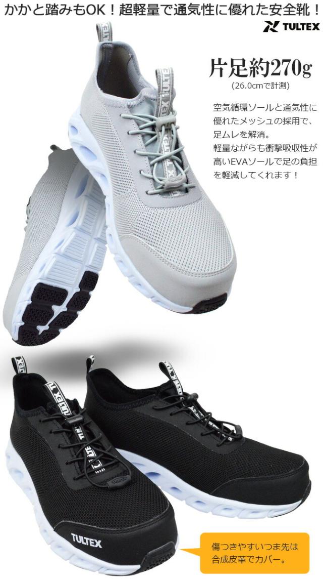 | スポーティーなワークブランドTULTEX(タルテックス)のつま先部分に樹脂先芯が入った軽量タイプの安全靴「AZ-51667」です。 空気循環ソールと通気性に優れたメッシュの採用で足ムレが解消され、とても快適です。 ミッドソールは衝撃吸収性が高く軽量なEVAを採用していますので、立ち仕事や歩く仕事でも疲れにくくなっています。 ストッパー付きのゴムタイプの靴紐が付いた、シュータンが一体型のスリッポンタイプですので、脱ぎ履きがスムーズにできて、フィット感の調整も簡単です。 踵部分には補強芯が入っていないので踵を踏んで履くこともできます。 | ||||||