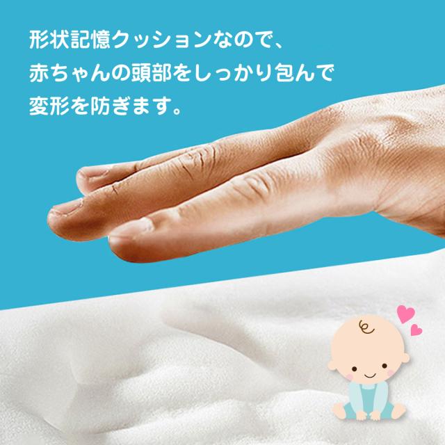 外側は高く、内側は低く。赤ちゃんの頭を均等に包んで優しく守ります。また、形状記憶クッションなので、赤ちゃんの頭部をしっかり包んで変形を防ぎます。