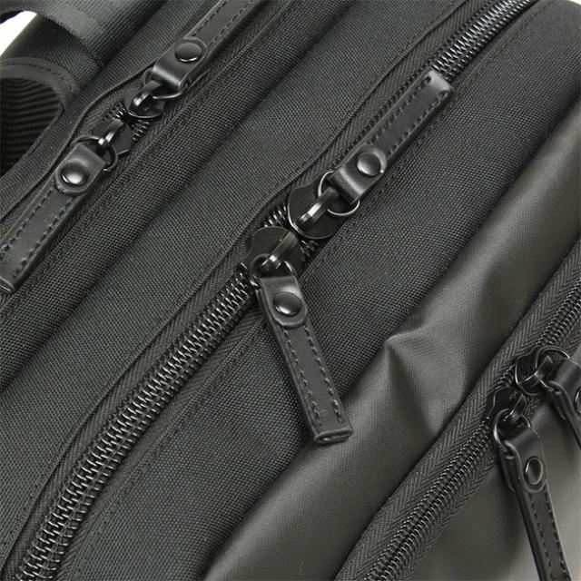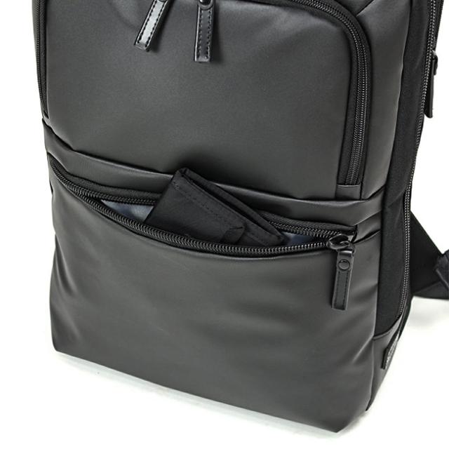 素材には、耐久性に優れた610Dコーデュラポリエステルの生地を採用。はっ水性や防汚性に優れたTPUコーティング加工を施した生地の表と裏の使い分けにより、同系色の落ち着いたデザインでありながら現代的な印象に仕上げられています。汚れやすい前面部・前面下部にコーティング加工面の生地を使用し、その他の部分には表の生地を使い分けました。本体側面ロゴ部分には質感の高いレザーを採用して、アクセントになっています。背面・肩ベルト裏面は通気性のよいメッシュ構造です。