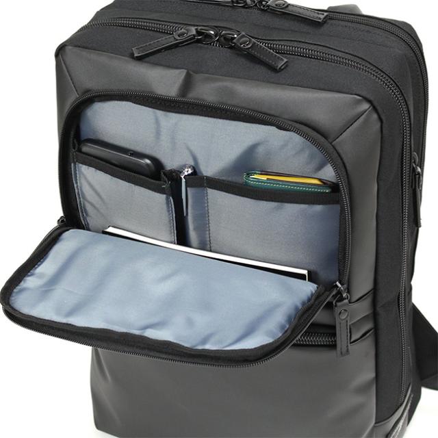 前面上部の前ポケットは開口部が大きく開いて内容物が見やすく、小物の整理に便利なオーガナイザー付き(マチ付きオープンポケット×1・ペン差し×1・オープンポケット×1)で使い勝手の良い仕様となっております。