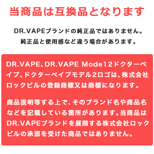 | 商品説明 | 最新の液漏れ防止構造 お気に入りのリキッドを楽しめる リキッドはカートリッジの約8割以上は注入しないでください。(注入しすぎると液漏れの原因になります) 1つのカートリッジで4、5回繰り返し使用可能(雑味を感じたら交換してください) 空(リキッドを入れない状態)の状態では故障の原因になるので使用しないでください。 ■当商品は互換品となります ・DR.VAPEブランドの純正品ではありません。純正品と使用感など違う場合があります。 ・DR.VAPE、DR.VAPE Mode12ドクターベイプ、ドクターベイプモデル2ロゴは、株式会社ロックビルの登録商標又は商標になります。 商品説明等する上で、そのブランド名や商品名などを記載している箇所があります。当商品はDR.VAPEブランドを展開する株式会社ロックビルの承認を受けた商品ではありません。 【詳細】 サイズ:約H52mm x Φ18mm 容量:約1.5ml 生産国:中国 【液漏れについてのご注意】 こちらのポッドは構造上、輸送に伴う激しい温湿度差により液漏れが発生してしまう場合がありますがリキッド・ポッド共に品質自体には問題ございません。 液漏れがあった場合には大変お手数ですが、ティッシュなどで引き取ってご使用くださいますようお願い申し上げます。 【液漏れ防止対策】 高温多湿や直射日光の当たる場所にポッドを放置しないでください。液漏れを防ぐため、箱を開封した後、未使用のポッドは、吸い口を下にして保管してください。 |