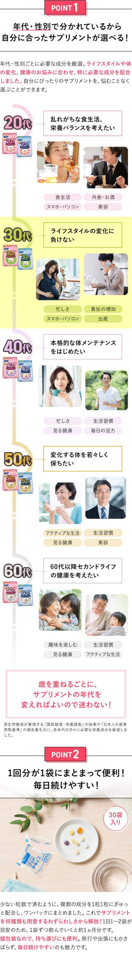 ライフスタイルの変化が大きい30代男性のための成分を厳選し、ワンパックに。サプリメントをこれから摂ろうと思っている人、摂り方のわからない方におすすめ!年代別・性別に適したサプリメントを、ワンパックにいたしました。どなたでも、自分にあったサプリメントを簡単に選ぶことができます。<ビタミンB&C>