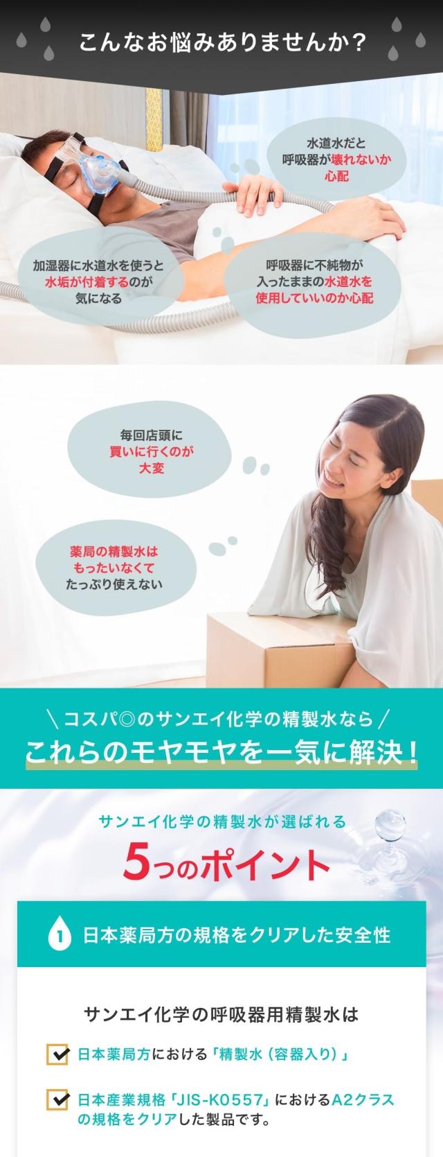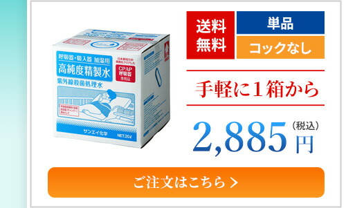 サンエイ化学の呼吸器用精製水は、日本薬局方および日本産業規格(JIS)におけるA2クラスの規格をクリアした製品です。CPAPのチャンバー用水 水素吸入器 在宅酸素などの加湿用水として。