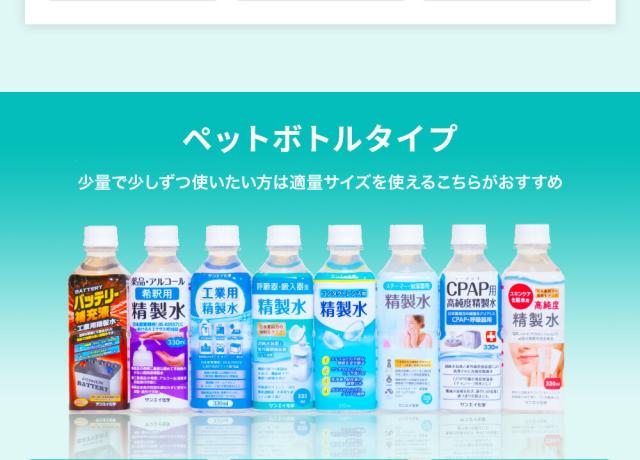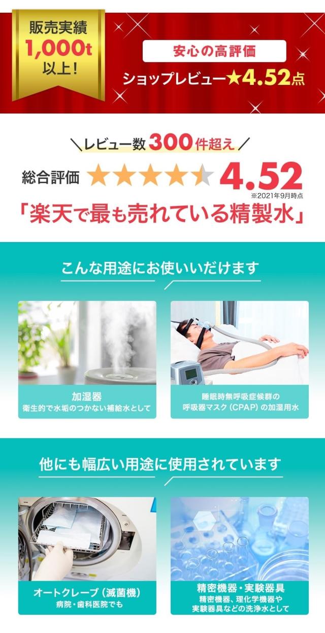 | 吸入や吸引など医療用の蒸気用水として ・シーパップ(CPAP)用のチャンバー用水として ・無呼吸症候群用(SAS)の呼吸器や吸入器に ・在宅酸素や水素吸入器の補給水に ・歯科 医院などでのオートクレーブ、蒸気滅菌器用の補給水 ・ハードコンタクトレンズのすすぎ液として ・食塩を混ぜて鼻うがい用の生理食塩水に スチーマーによる加湿・保湿・湿潤用 ・エステサロン、美容院、美容室、理容室での美顔器やスチーマー用水 ・加湿器やボイラー、蒸気アイロン、フェイススチーマーなどのスチーム用水 ・スチーム製品の水垢やウォータースポットの防止に エステやアロマなどのビューティー用 ・化粧用やメイクなど。化粧水やパックの溶解水に ・プレ化粧水用として ・ナノケアなどナノイー製品などの美顔器によるスキンケア、フェイスケア ・アロマオイル、イオンスチーマー、オイルミスト、アロマスプレーなど ・ガーゼやコットン、脱脂綿に含ませて洗顔、クレンジングなどに ・オリーブオイルと一緒にヘアパック用として ・ヘアスプレー、ヘアミスト、ヘアオイル、ヘアアイロンなどのヘアケア用 ・コットンもしくはシートマスクに含ませて精製水パックに ・グリセリンやオーガニック製品の希釈に ・ネイル、ジェルネイル時の無水エタノールの希釈水として アルコール消毒液などの衛生的な用途に ・無水エタノールを消毒用アルコールに ・殺菌剤や除菌水、除菌スプレーの原料として ・グリセリンや尿素などと混ぜて手作り化粧水 ・苛性ソーダと混ぜて手作り石けんに ・ハッカ油と混ぜて抗菌・虫除けスプレーなどに ・アルコール(無水エタノール)と混ぜてアロマスプレーなどに ・ウェットティッシュなどに含ませて赤ちゃんのおしりふきなど ・液晶、窓ガラス、グラスなどのガラス製品の拭き取りや掃除用に ・滅菌器用の次亜塩素酸水の作製に 病院・学校・研究室などで ・実験 器具の洗浄に ・各種分析用として ・純水器や純水、RO水、蒸留水の代用にも |