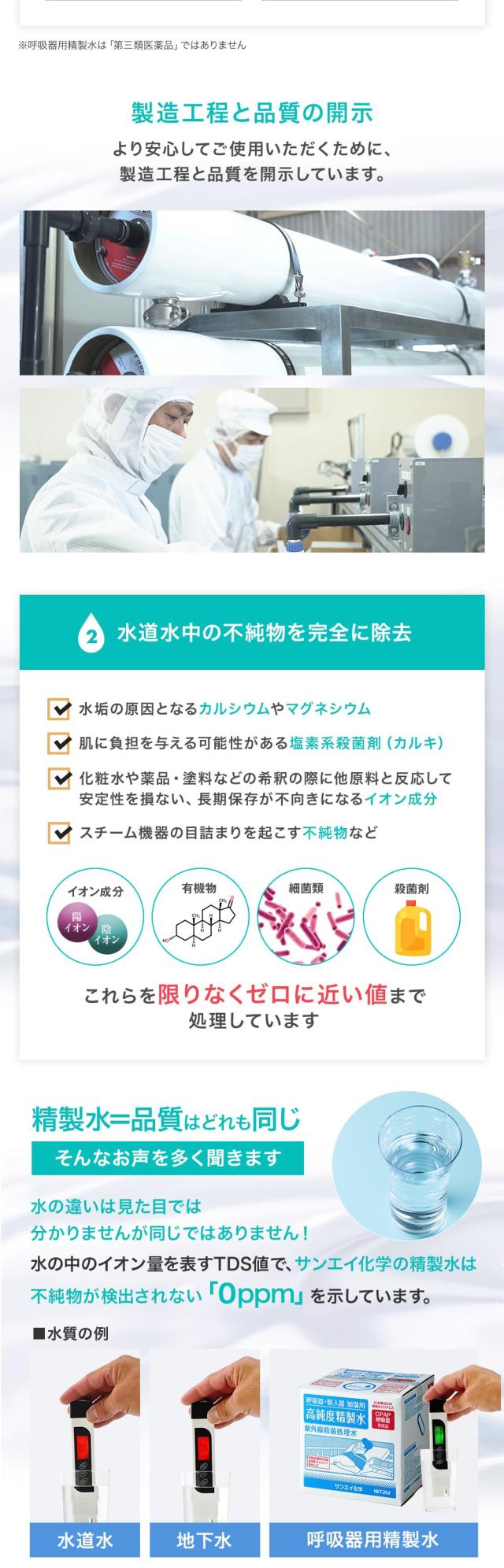 【高純度の精製水】サンエイ化学の呼吸器用精製水は3段階のろ過工程に加えて、紫外線殺菌を行った限りなく純水に近い滅菌精製水。逆浸透膜とイオン交換樹脂でイオン成分を完全に除去、有機物やカルキなどの殺菌剤を限りなくゼロに近い値まで処理しています。