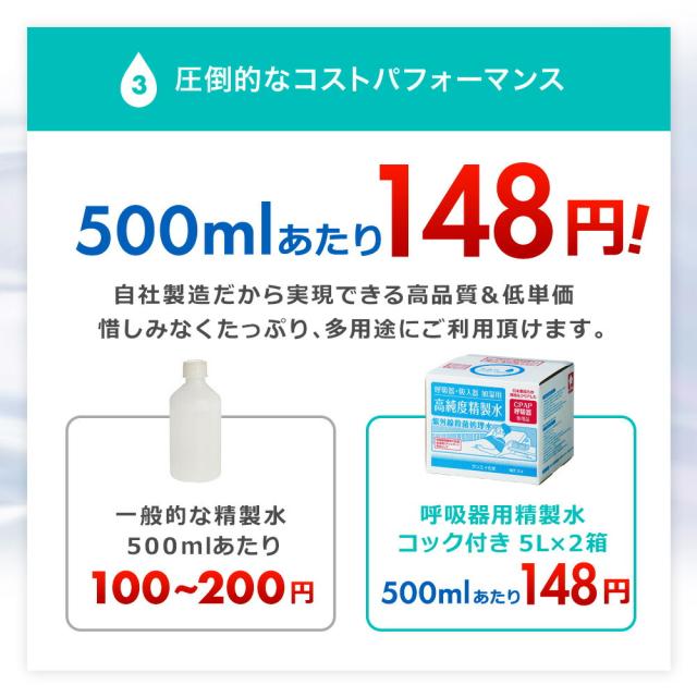 サンエイ化学の呼吸器用精製水は、日本薬局方および日本産業規格(JIS)におけるA2クラスの規格をクリアした製品です。CPAPのチャンバー用水 水素吸入器 在宅酸素などの加湿用水として。