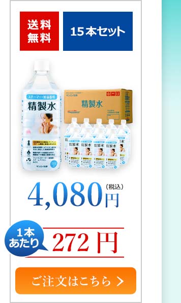 サンエイ化学のスチーマー用精製水は、日本薬局方および日本産業規格(JIS)におけるA2クラスの規格をクリアした製品です。加湿器や美顔器 スチーム アイロン 呼吸器 吸入器の蒸気用水に。