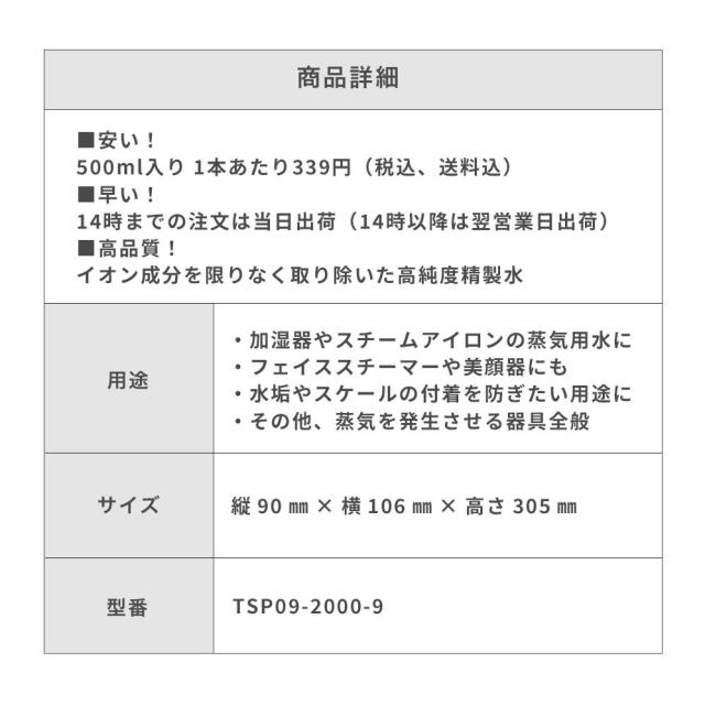 サンエイ化学 スチーマー用精製水 2L×9本 の特長と主な用途