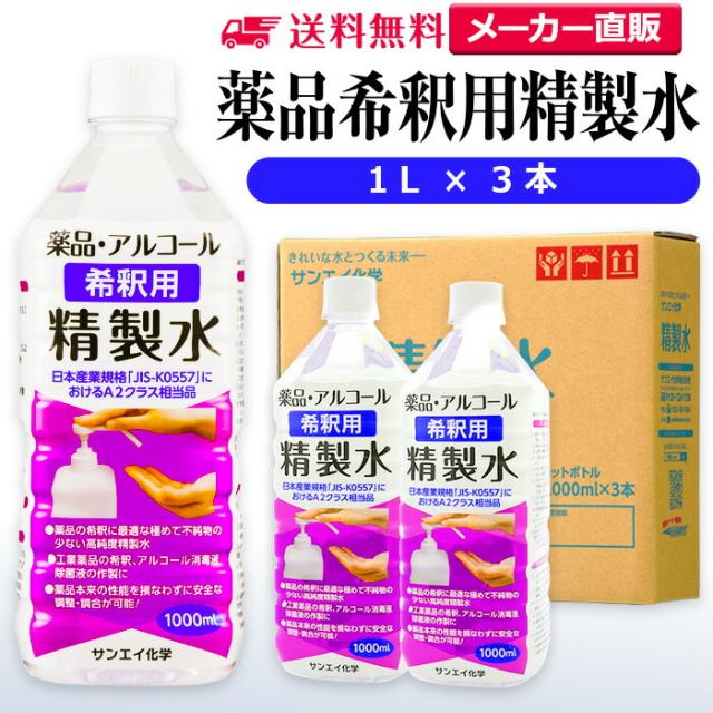 精製水 1l サンエイ化学 精製水 薬品・アルコール 希釈用 精製水 1L × 3本セット 除菌水や除菌スプレーの希釈水に