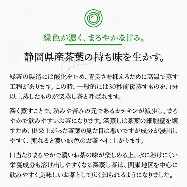 - 美味しいお茶が飲みたくて、購入しました。5gを80度のお湯で30秒その通りに入れると美味しかった。久しぶりに美味しいお茶をいただきました。