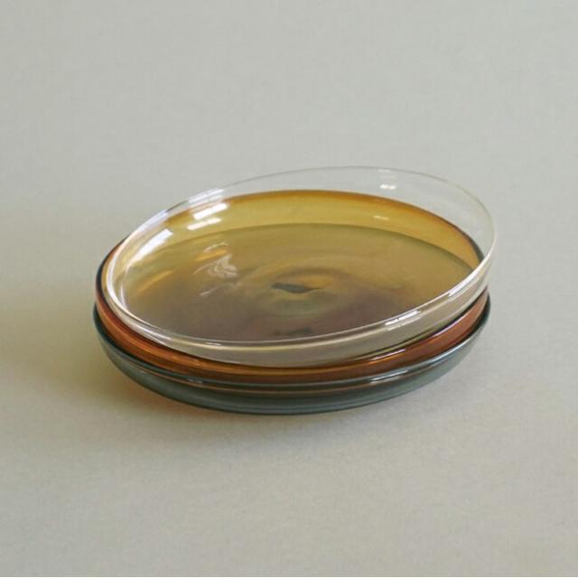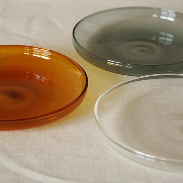 型吹きグラスならではの色や厚みのムラが、シンプルなプレートにニュアンスを加えています。