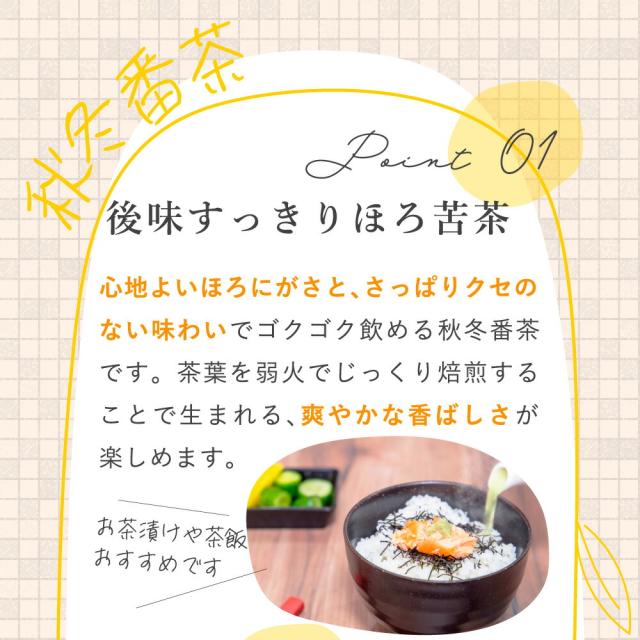 - 大容量の茶葉の秋冬番茶は格安で買えるけど、水出しにするためのティーバッグへの詰め替えが面倒で最後まで飲みきれないこともありました。この秋冬番茶は1包4gで丁度良くて楽です。スッキリとした美味しさが食事...