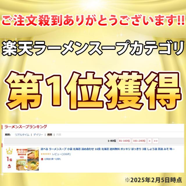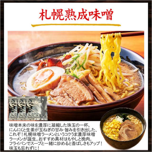 | 内容・規格 | ラーメンスープ 札幌濃厚豚骨味噌、北海道極み昆布醤油、北海道コク旨塩(ラウシップ塩)、札幌焦がし醤油、札幌熟成味噌 | ||
