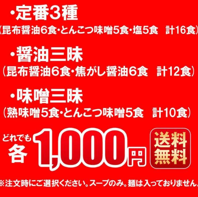 | 配送方法 | メール便 | 内容量 | ・定番3種おまけ付(昆布醤油6食・とんこつ味噌5食・塩5食)16食 ・醤油三昧(昆布醤油6食・焦がし醤油6食)12食 ・味噌三昧(熟味噌5食・とんこつ味噌5食)10食 3タイプからお選びください ※スープのみです。 |