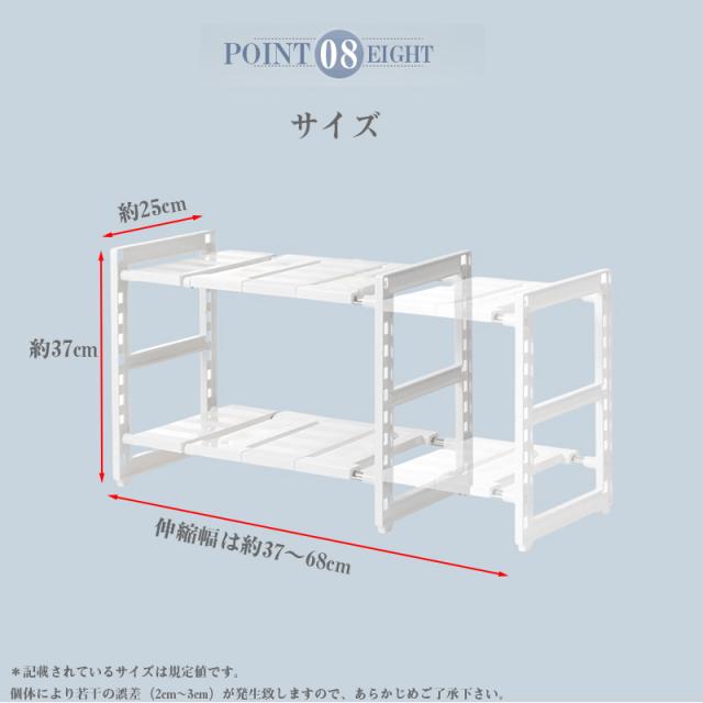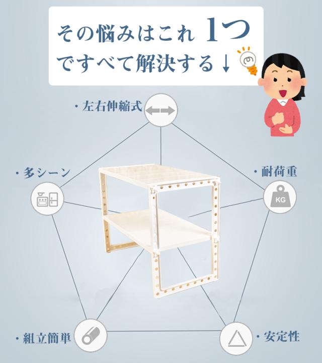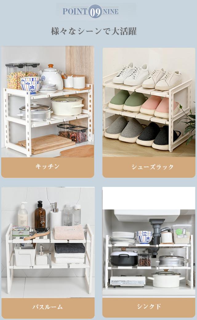| 商品特徴 | ★2段式ラック a.幅は37〜68伸縮可能 b.上下段の棚の高さは13段階調節できる c.各棚板も左右にスライドすることができる。装着も取外しも自由に。 ★組立簡単 ネジを使わず誰でも簡単・すぐに組み立てられる収納棚です。 置くものに合わせて幅や高さを変えることができます。排水管を避けて設置できるので便利です。 ★用途広い 収納するものに合わせてラックの形が自由に変えるので、食器収納、厨房の調味料収納、寝室化粧品収納、リビングシューズ収納、ベランダー盆栽収納、浴室用品収納、本棚、玄関、用途がいろいろあります。 |