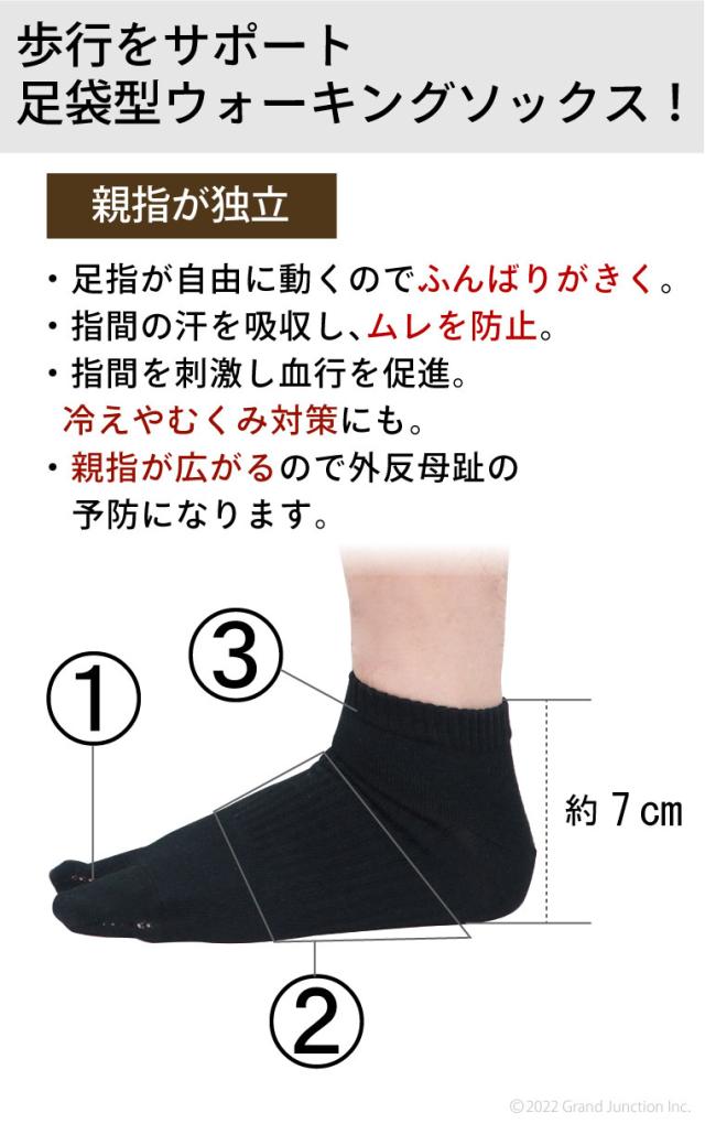■親指が独立している足袋型ソックスは、親指が自由に動かせるので足指で地面をとらえる歩き方ができます。 それによって指が鍛えられるので外反母趾の予防や、疲れにくい正しい歩行がしやすくなるといった効果があります。
