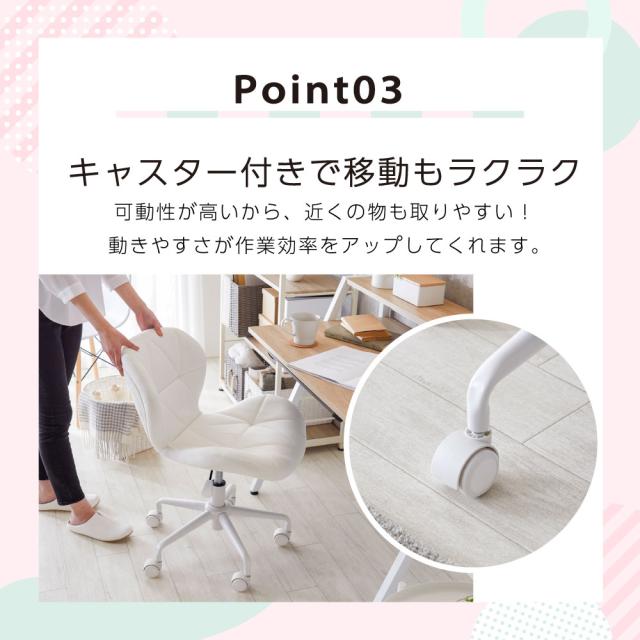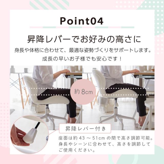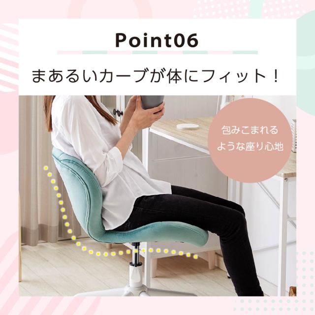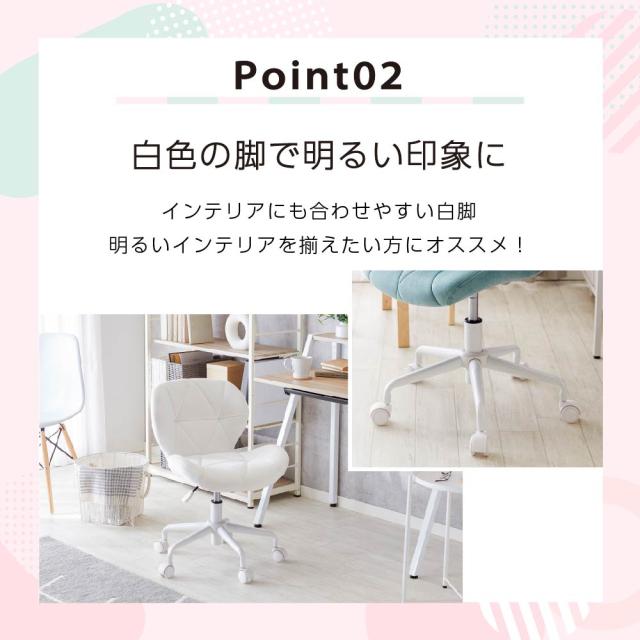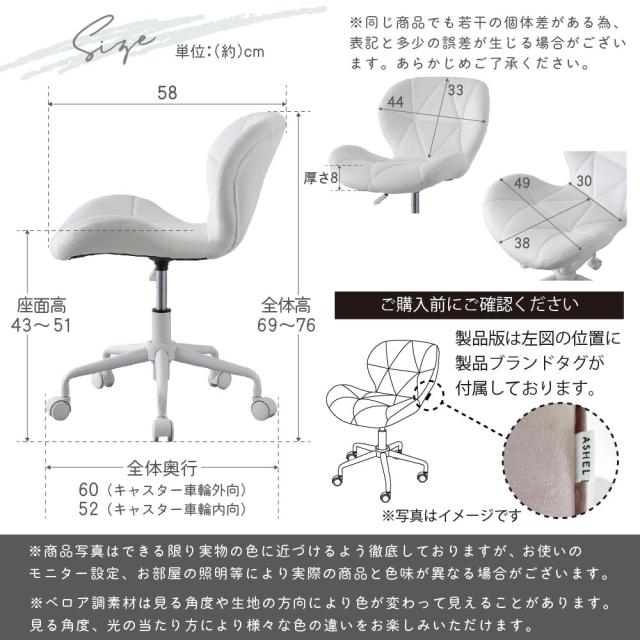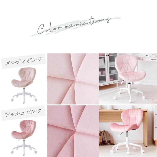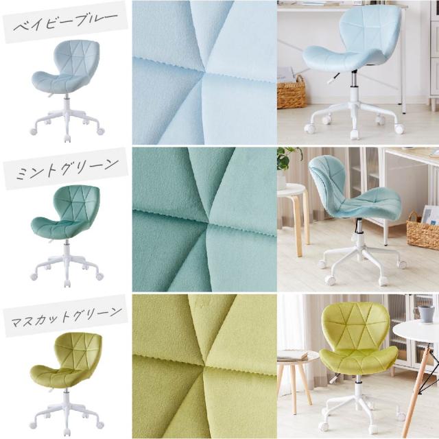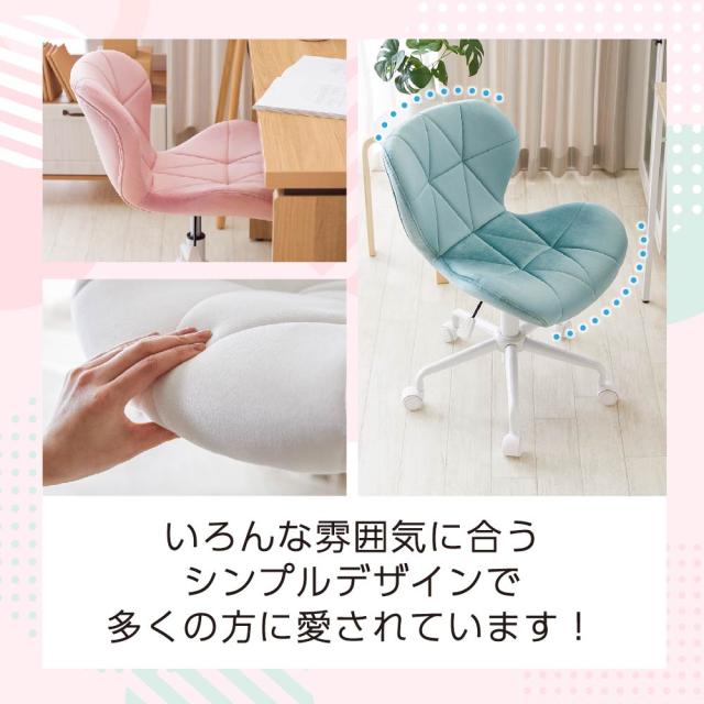 ■商品説明:パステルカラーのベロア生地がかわいい回転式の白脚(ホワイト脚)デスクチェアです。コンパクトなデザインで女性向けとして人気。子供用のデスクチェアにも。在宅ワーク、リモートワーク用のチェア、PCチェアから、サロンや飲食店など、法人の方・ショップ用としてもご好評です。